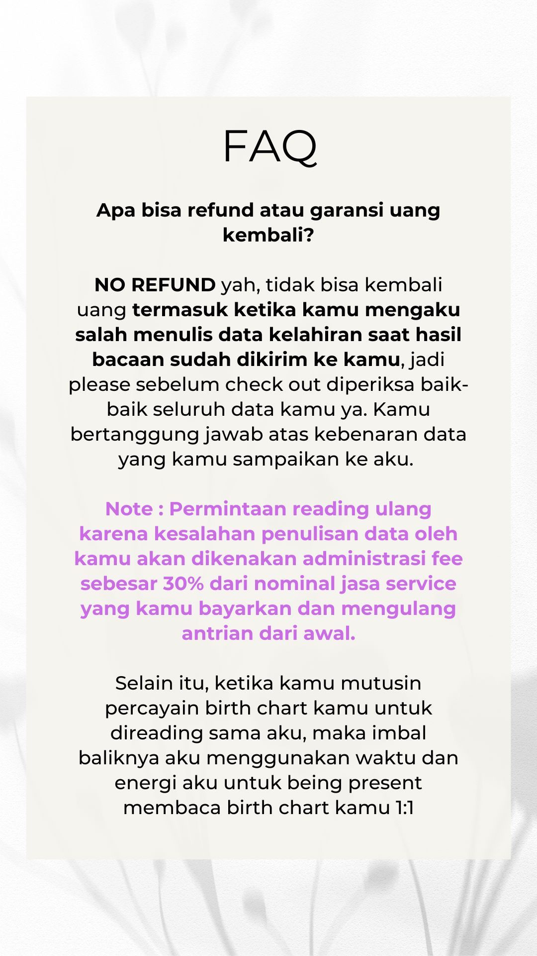1. Note : Permintaan reading ulang karena kesalahan penulisan data oleh kamu akan dikenakan administrasi fee sebesar 30% dari nominal jasa service yang kamu bayarkan dan mengulang antrian dari awal.